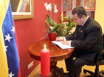 Председник Владе Републике Србије Ивица Дачић уписао се данас у књигу жалости у Амбасади Венецуеле у Београду поводом смрти председника Боливарске Републике Венецуеле Уга Чавеза.