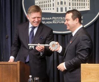 Фицо, који је први високи званичник неке државе чланице ЕУ који је допутовао у Београд након отварања приступних преговора, симболично је Дачићу уручио кључ капије Европске уније, као израз подршке његове земље Србији.