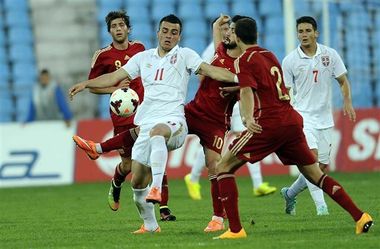 Млада фудбалска репрезентација Србије играла је вечерас у Јагодини против селекције Шпаније нерешено 0:0, у првој утакмици баража за учешће на првенству Европе.