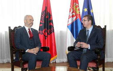 Председник Владе Републике Србије Александар Вучић дочекао је данас испред Палате Србија, уз интонирање химни двеју земаља, председника Владе Албаније Едија Раму, који је допутовао у званичну посету Србији.