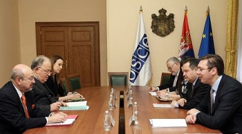 Вучић је, у разговору са генералним секретаром ОЕБС-а Ламбертом Занијером, специјалним представником председавајућег за Украјину Хајди Таљавини и шефом Специјалне посматрачке мисије ОЕБС-а у Украјини Ертугрулом Апаканом, истакао да Влада Србије пружа пуну подршку спровођењу Споразума из Минска.