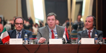 Слева: Ђузепе Манцо, Александар Вучић и председник Италијанског друштва за међународне организације Франко Фратини