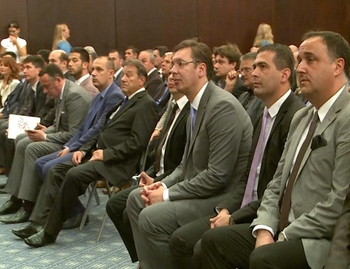 Вучић и ресорни министри у Влади Србије присуствовали су, такође, свечаној седници Општине Врњачка Бања, одржаној поводом обележавања Дана општине, на којој су уручена признања заслужнима.