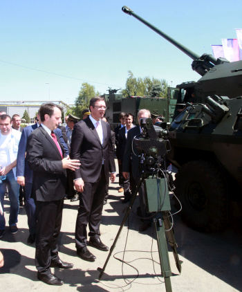 Вучић је са министрима одбране Братиславом Гашићем, унутрашњих послова Небојшом Стефановићем и начелником Генералштаба Војске Србије Љубишом Диковићем присуствовао презентацији дела производног програма - самоходне топ хаубице “Нора” и вишенаменског оклопног борбеног возила “Лазар 2”, као и опреме војника будућности ВБ 10.