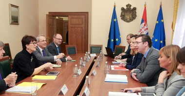 Вучић је током састанка са посланицима Европског парламента истакао да Србија остаје потпуно посвећена испуњавању свог спољнополитичког приоритета, а то је пуноправно чланство у ЕУ.