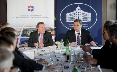 Вучић је претходно на радном ручку са домаћим и страним привредницима и младим предузетницима, којем је присуствовао и бивши немачки канцелар, истакао да је за Србију важно то што од Шредера може да научи како да примени тешке реформе.