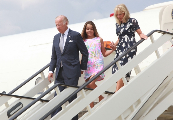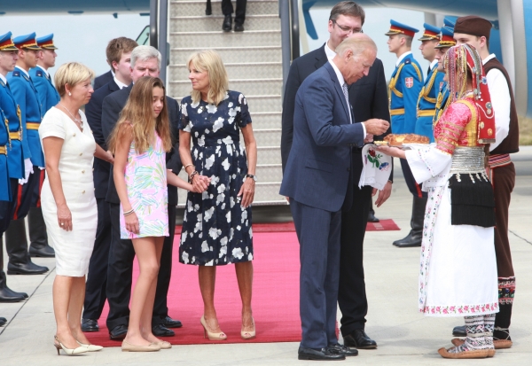 Бајден, који је у нашу земљу допутовао у друштву своје супруге, на аеродрому је традиционално послужен погачом и сољу, уз постављену Гарду Војске Србије и црвени тепих.