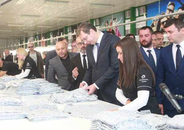 Вучић је потом са амбасадором Турске у Србији Мехмедом Кемалом Бозајем, власницима "Тибет моде" и председником општине Ћуприја Нинославом Ерићем обишао производни погон и разговарао са запосленима.