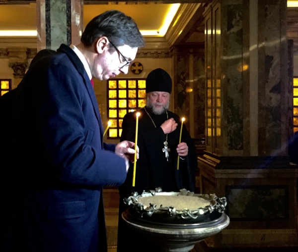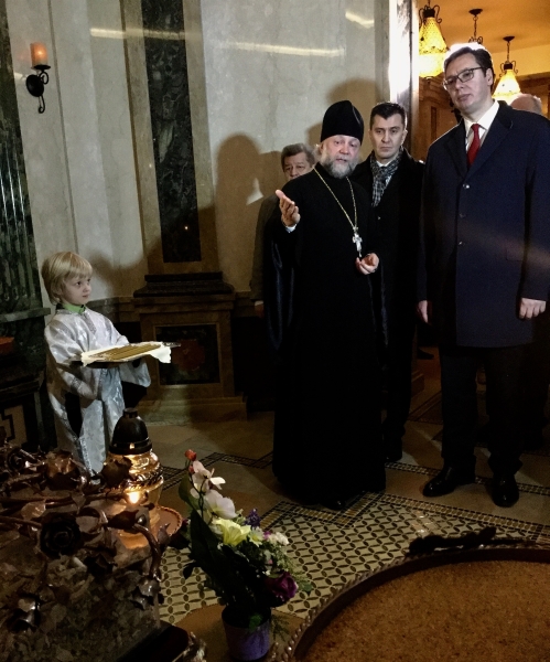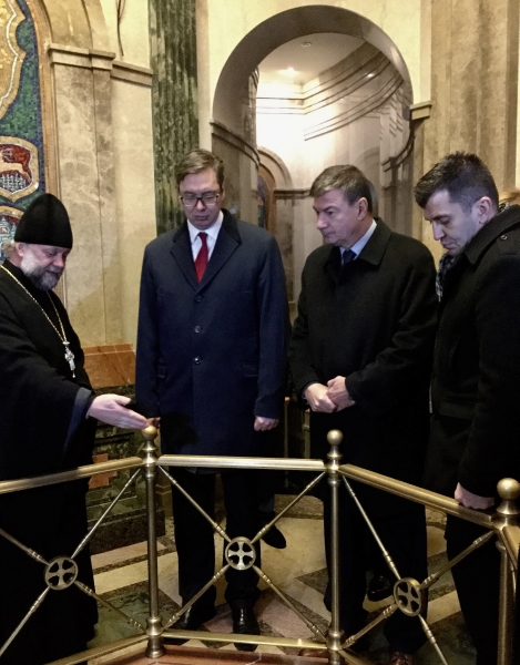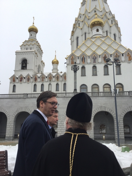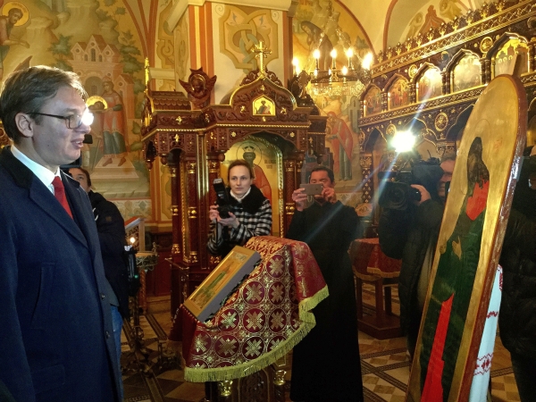 Председник Владе Републике Србије Александар Вучић обишао је данас Храм свих светих у Минску, где је разговарао са свештенством, које му је уручило велику икону Јована Крститеља – поклон за Храм Светог Саве у Београду.