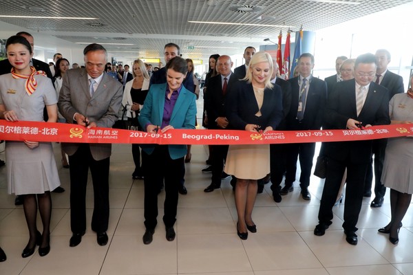 Брнабић је први авион на новој интерконтиненталној линији дочекала са потпредседником Владе и министром грађевинарства, саобраћаја и инфраструктуре Зораном Михајловић и амбасадором НР Кине у Србији Ли Манчангом, као и представником авио-компаније "Хајнан ерлајнз".