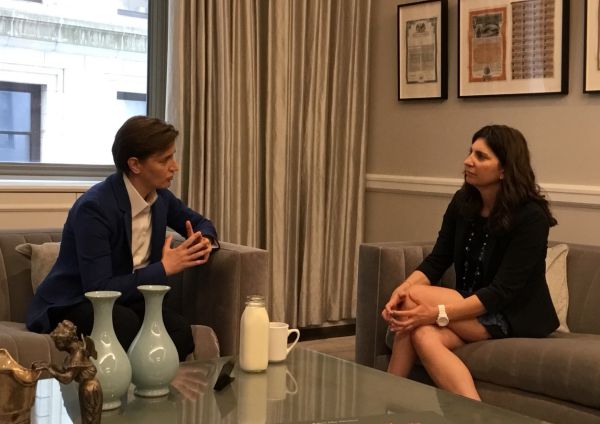 Као прва жена председница Владе Србије и прва жена председница Њујоршке берзе, Брнабић и Канингхам су разговарале о заједничким изазовима са којима се суочавају у послу.