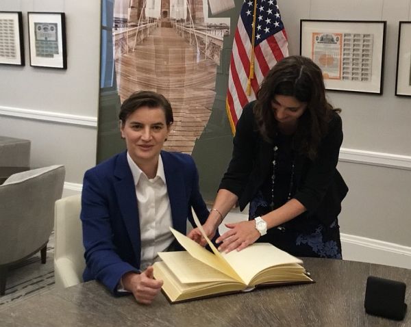 Премијерка се уписала у Књигу утисака и поклонила Канингхам књигу о Николи Тесли.