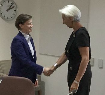 Председница Владе Републике Србије Ана Брнабић разговарала је у Вашингтону са директорком Међународног монетарног фонда (ММФ) Кристин Лагард о сарадњи те међународне финансијске институције са нашом земљом, која је, како је оценила директорка ММФ-а, земља за пример.