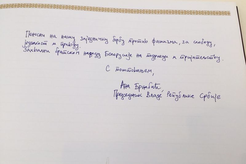Председница Владе Републике Србије Ана Брнабић данас је, током једнодневне посете Минску, где учествује на састанку уже групе Минхенске безбедносне конференције, обишла Музеј историје Великог отаџбинског рата, и том приликом се уписала у књигу утисака.