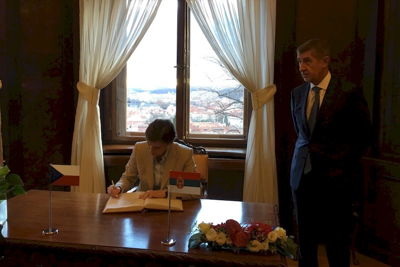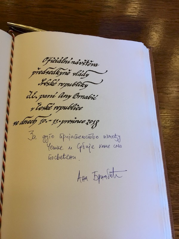 Након свечаног дочека, премијерка Србије је уписала у Књигу гостију: „За дуго пријатељство између Чешке и Србије коме смо посвећени“.