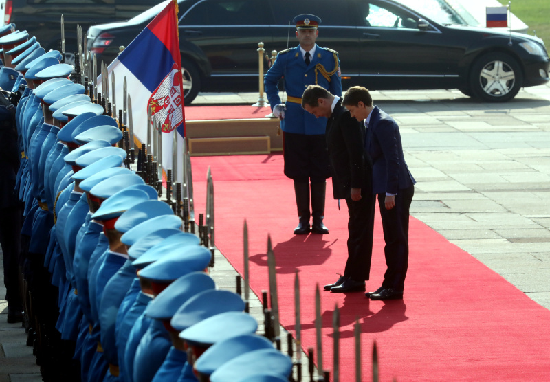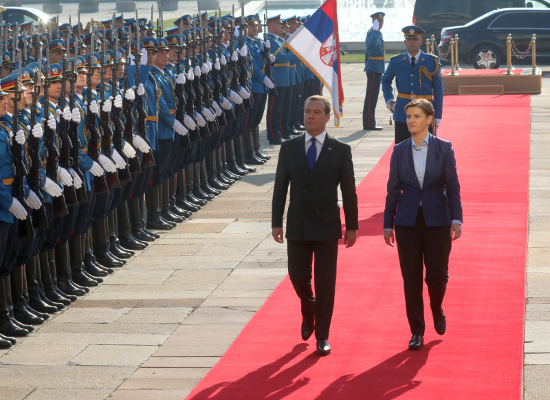 Председница Владе Републике Србије Ана Брнабић приредила је данас после подне, испред Палате Србија, свечани дочек за председника Владе Руске Федерације Дмитрија Медведева, који борави у званичној посети Србији.