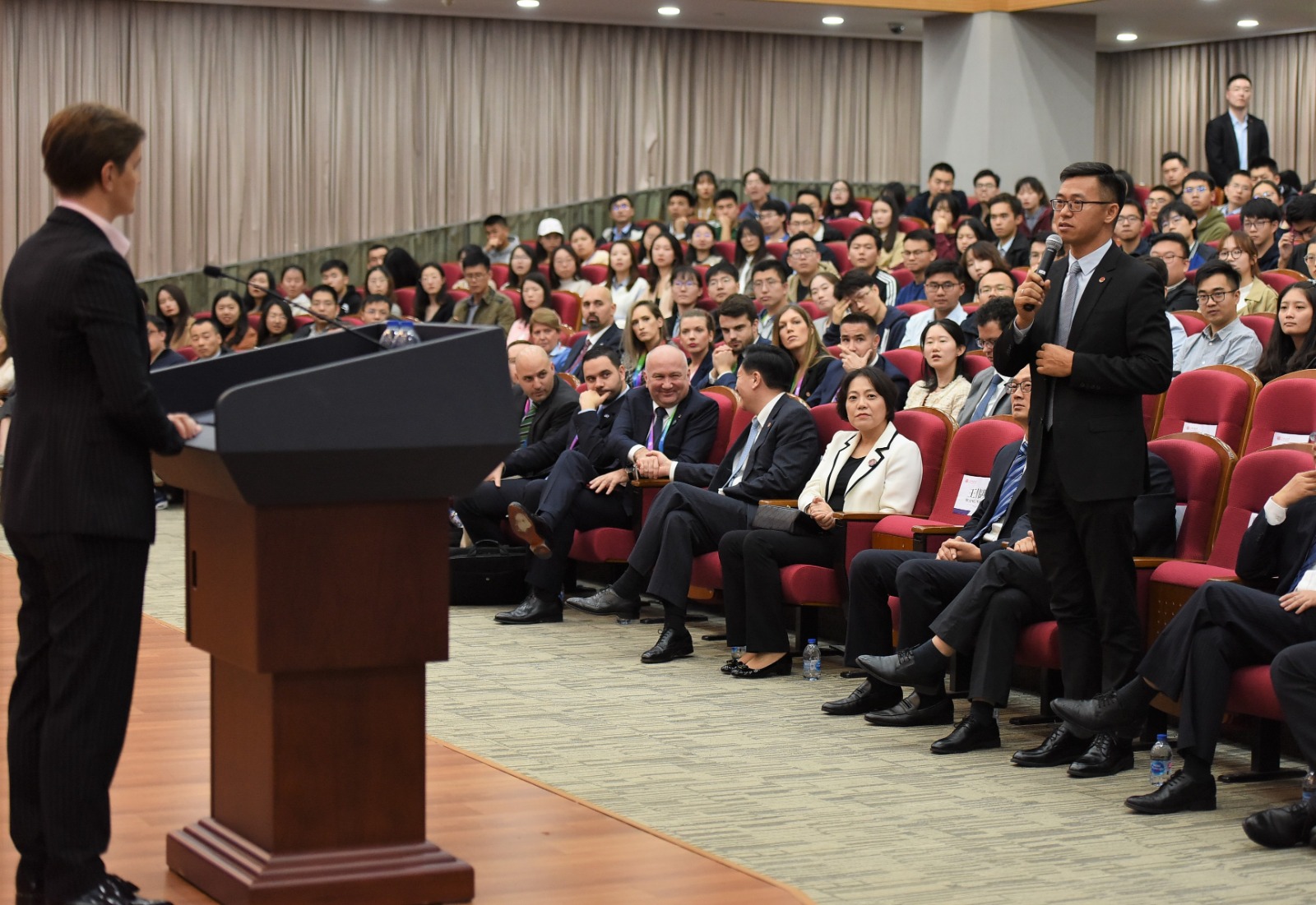 На питање кинеског студента о сарадњи Србије и Кине, Брнабић је одговорила да две земље имају стратешко партнерство, да Србија подржава политику једне Кине, док Кина подржава територијални интегритет Србије и пружа подршку нашој земљи у међународној арени, пре свега у Уједињеним нацијама.