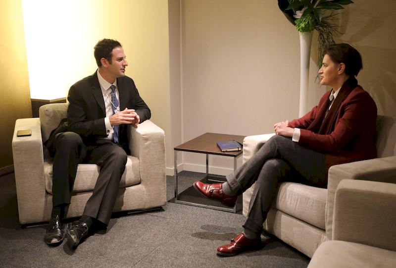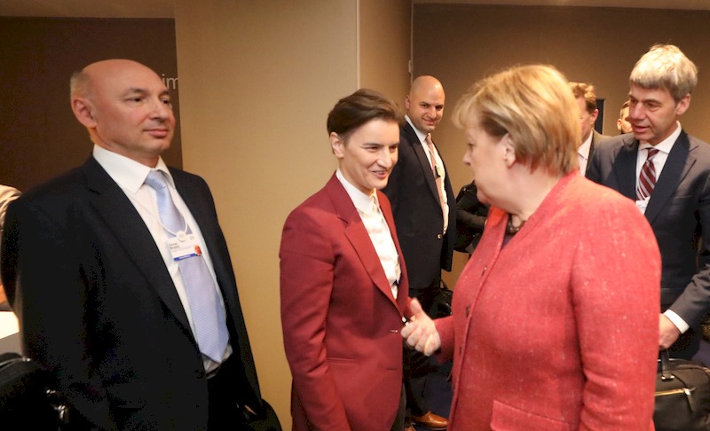 Премијерка, која у Давосу учествује на 50. годишњем састанку Светског економског форума, сусрела се данас са немачком канцеларком Ангелом Меркел, а имала је и низ сусрета са представницима великих светских компанија - председником компаније "Visa" Рајаном Мекајнернијем и са извршним директором "Google Jigsaw" Џаредом Коеном.