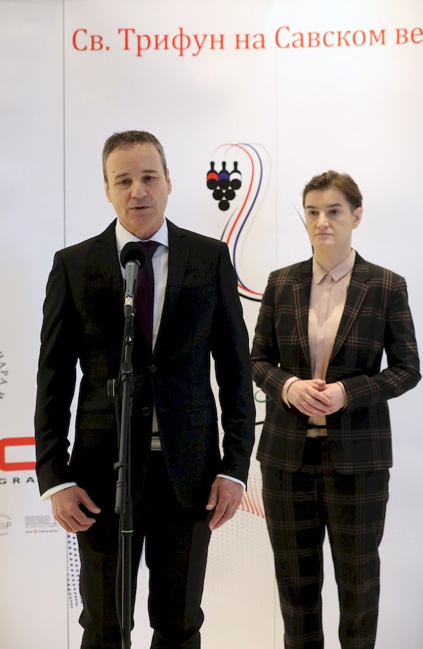 Председница Владе Републике Србије Ана Брнабић присуствовала је данас оцењивању српских вина у оквиру манифестације "Свети Трифун на Савском венцу", који је први пут организовао Савез винара и виноградара Србије.
