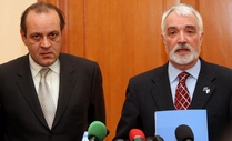 Деметре Даскалопулос и Мирољуб Лабус обраћају се новинарима након састанка представника Владе и "Европског округлог стола"