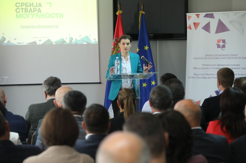 Председница Владе Републике Србије Ана Брнабић пренела је данас привредницима Крагујевца мере државе за подстицај иновација које ће Србију позиционирати на потпуно другачији начин на економској мапи света.
