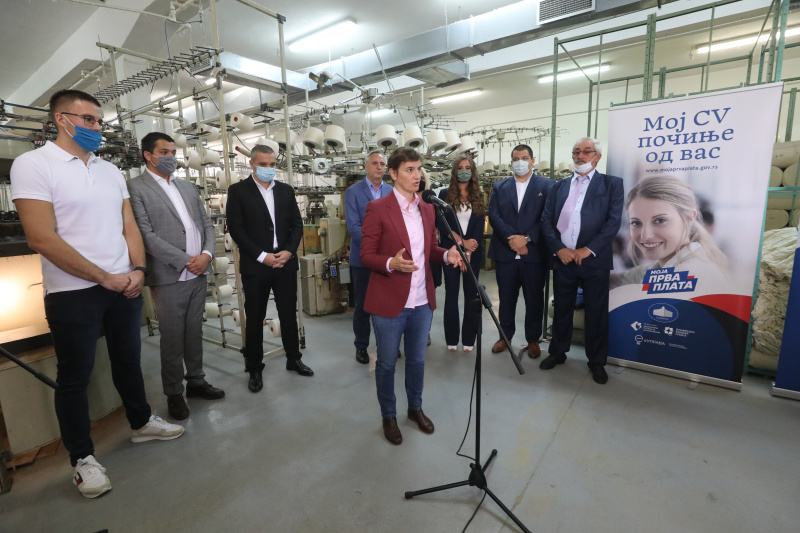 Брнабић је у Ариљу, где је присуствовала промоцији другог циклуса програма „Моја прва плата” у породичној компанији ”Богутово“, која је у првом циклусу тог програма ангажовала деветоро младих, објаснила да је циљ програма да 10.000 младих са средњим и високим образовањем стекне прво радно искуство.