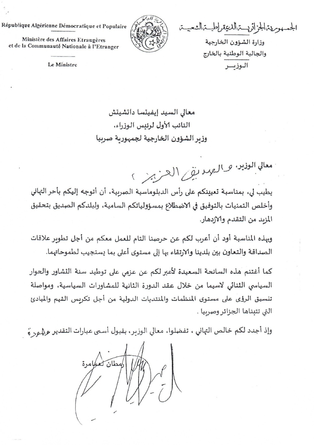 Министар иностраних послова Демократске Народне Републике Алжир Рамтан Ламамра честитао је првом потпредседнику Владе Републике Србије и министру спољних послова Ивици Дачићу ступање на нову дужност.