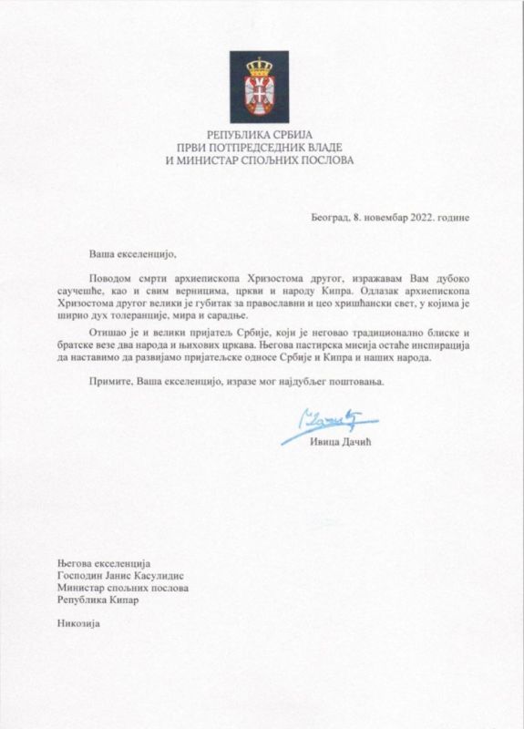 Његова пастирска мисија остаће инспирација да наставимо да развијамо пријатељске односе Србије и Кипра и наших народа”, наводи се у саучешћу првог потпредседника Владе.