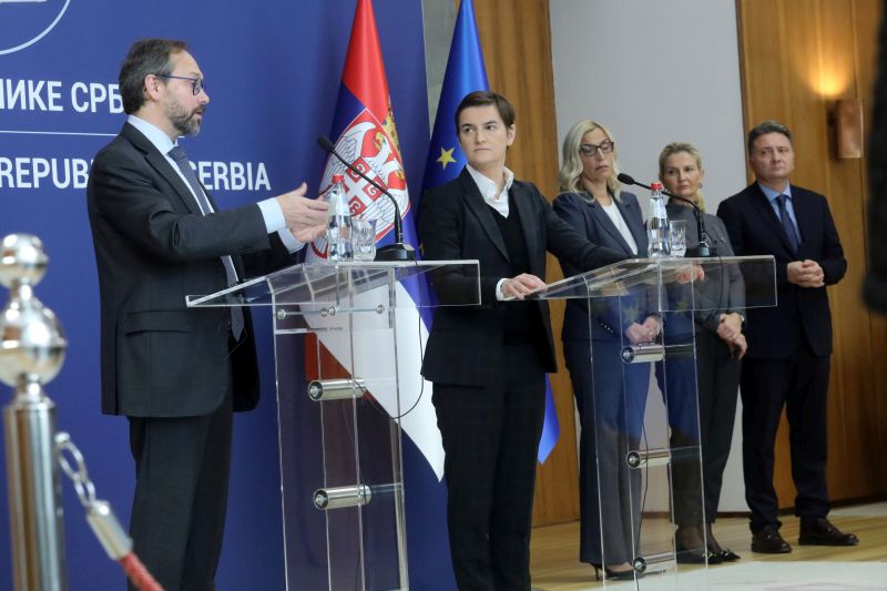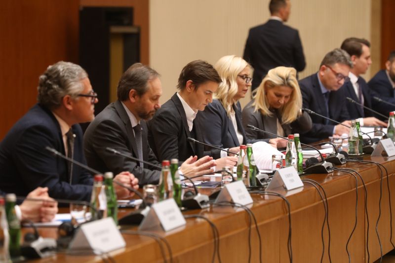 Брнабић је, након састанка са шефом Делегације ЕУ у Србији Емануелеом Жиофреом и амбасадорима земаља чланица Европске уније, који је одржан у Палати Србија, навела да се данас разговарало о три основне теме.