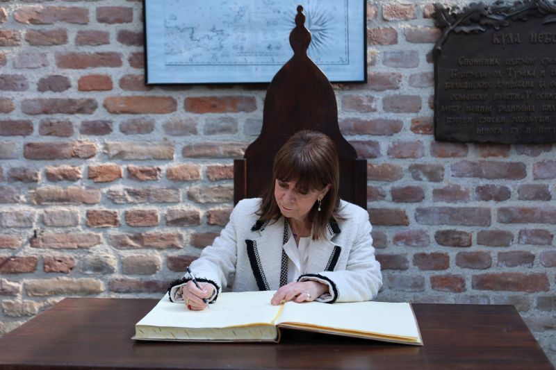 Председница Републике Грчке Катерина Сакеларопулу положила је јутрос, у присуству потпредседнице Владе Републике Србије и министарке културе Маје Гојковић, венац на споменик Риги од Фере у Београду.