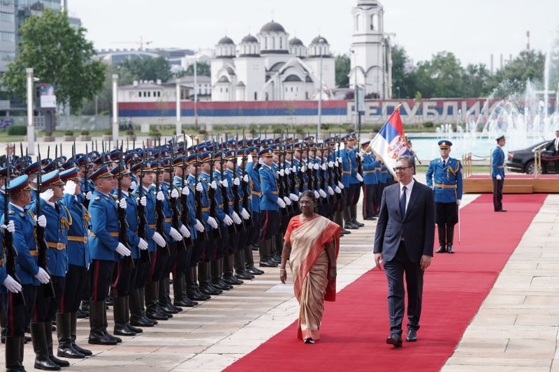 Председницa Индије је дочекана уз највише државне почасти, црвени тепих, постројену Гарду Војске Србије и интонирање химне двеју држава.