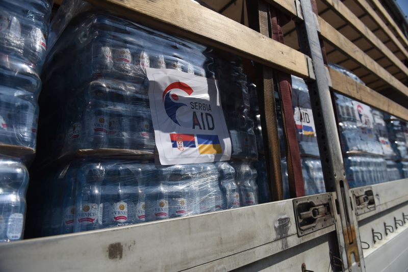 Она је, говорећи о упућеној роби, објаснила да је реч о помоћи коју може да искористи народ Украјине који је изгубио своје домове након пуцања бране, прецизиравши да су то ћебад, јастуци, сунђери за спавање на поду, али и филтери за пречишћавање воде, као и вода за пиће.