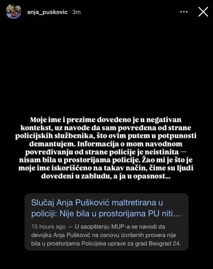 „Моје име и презиме доведено је у негативан контекст, уз наводе да сам повређена од стране полицијских службеника, што овим путем у потпуности демантујем. Информација о мом наводном повређивању од стране полиције је неистинита – нисам била у просторијама полиције. Жао ми је што је моје име искоришћено на такав начин, чиме су људи доведени у заблуду, а ја у опасност…ˮ, наводи се у објави А. П.